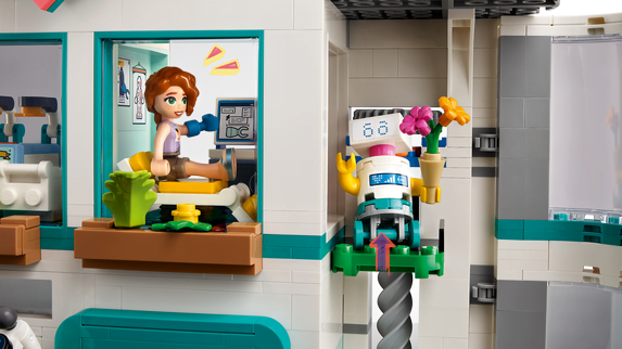 - LEGO® Friends personages – inclusief 5 minipoppetjes, waaronder Autumn met een extra gezicht om haar emoties te tonen terwijl ze haarnieuwe armprothese laat plaatsen, 2 babyfiguren, een speelgoedrobot en een hondenfiguur