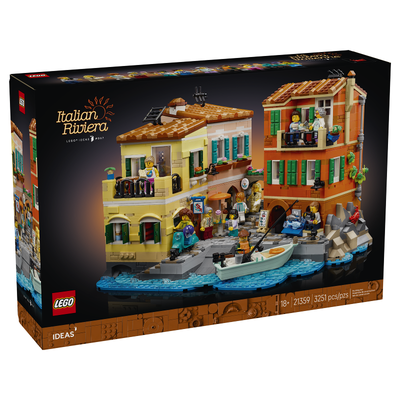 Til de daken en bovenste verdiepingen van de drie gebouwen op om de gedetailleerde interieurs te bekijken. Er is een Italiaanse ijswinkel, een duikwinkel en een vismarkt en boven de winkels vind je de huizen van de winkeliers. De set bevat 10 LEGO minifiguren om authentieke scènes mee te creëren: een visser in een bootje op de Middellandse Zee, een nonna die haar kleinzoon pasta en focaccia leert maken, een restaurantcriticus die de lokale keuken uitprobeert, een scooterrijder die door de straat rijdt… en een kitten dat een gestolen vis eet in het steegje! Deze LEGO Ideas bouwset om te verzamelen bevat 3251 onderdelen.