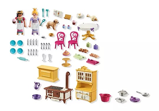 De koninklijke keuken bruist van activiteit! Boordevol charmante details zoals een gelaagde serveerschaal, deegroller en zelfs een kookboek voor koninklijke recepten, is het perfect voor creatief spelen. De hond wacht vol spanning op een smakelijke kruimel, terwijl de muis stiekem naar de lekkernijen gluurt. Met prachtig ontworpen meubels en realistische keukengereedschappen brengt deze set de magie van koninklijk koken tot leven. Deze PLAYMOBIL-set is een geweldige aanvulling op het Prinsessenkasteel (productnummer: 71845) en zal zowel beginnende chef-koks als verhalenvertellers zeker bekoren!
